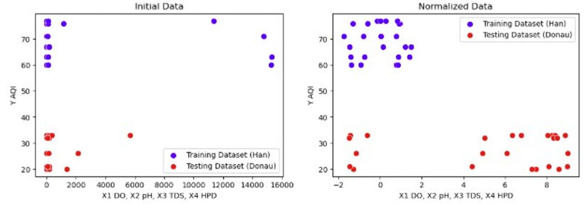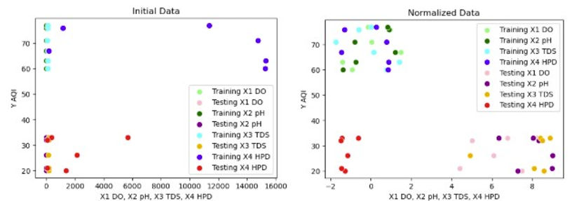 To consider whether an increased number of rivers within the dataset has a possibility of improving the model’s predictions of the AQIs, the clustering must be present throughout the analysis of the model, allowing the model to create a regression passing through every cluster. While analyzing the clustering of data for every model would be ideal, creating and examining scatterplots of 185 combinations of models and feature selections would prolong and complicate the study to a great extent. Hence, the scatterplots of data after normalization and applying PCA feature selection were selected for analysis as such scatterplots are apt for visualization. The scatterplot of initial data is provided below alongside that of normalized data in figures 8-9.