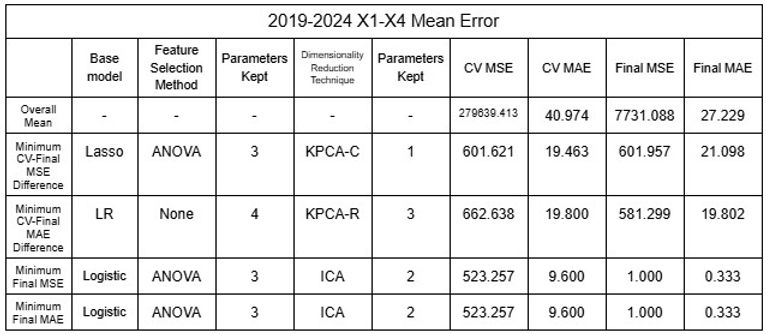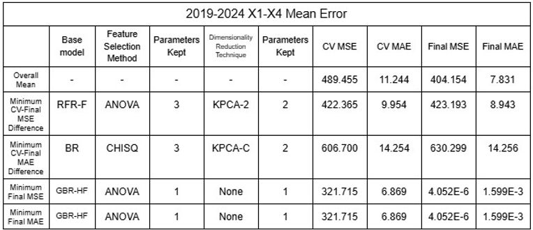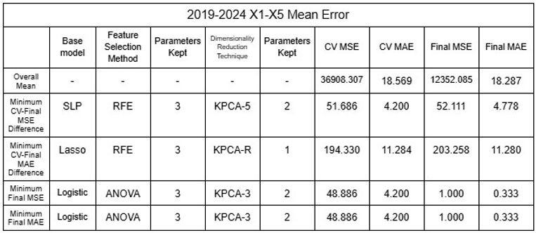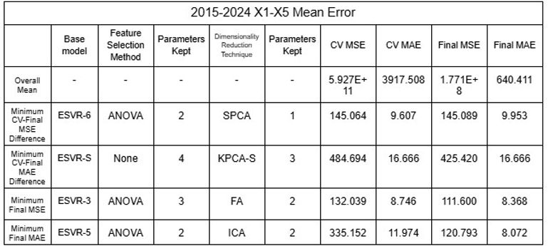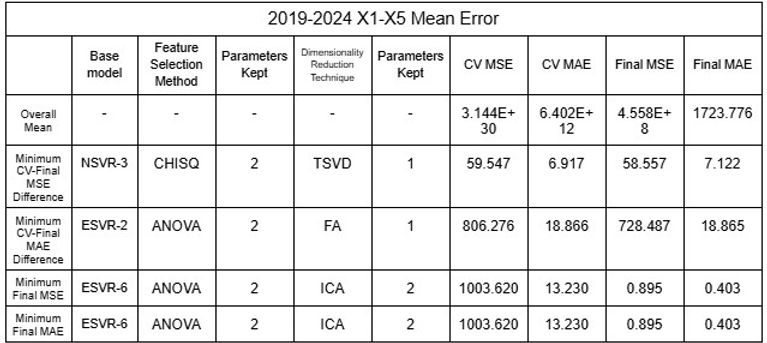 After identifying that the inaccuracy of the model was likely due to the clustering of data public data was utilized to increase the dataset of rivers the model could be trained and tested with [16-19]. Two different sets of data were tested: 2015-2024 and 2019-2024, each of 65 and 44 rivers from various nations around the world. Additionally, because total population appeared to show correlation with the predictions when testing, additional datasets were used with population as X5 variable. Using the mean values and considering each river as a plot, the dataset was shuffled with the models to test the model’s reliability by randomizing the large number of data it uses for training and testing. All models (regressors and classifiers) discussed above were utilized and dimensionality reduction techniques were distinguished from feature selection methods and applied as the last layer of the model to ensure accuracy by undergoing noise reduction with feature selection before changing interpretability with dimensionality reduction; this procedure allowed 11,632 different permutations to be tested, accumulating to be over 45,000 for all datasets combined. RFE was not applied to NuSVR, Epsilon SVR, BR or HGBR because such regressors do not rank features automatically, which is required to implement RFE. K fold Cross-Validation was also implemented to increase accuracy of model, and 5 folds were conducted for each permutation. As the data was randomized, five trials were conducted to confirm its accuracy. The results of the minimum errors are provided in Tables 21 to 32.