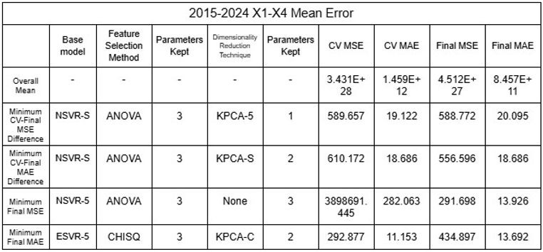 The low values of mean error clearly indicates that the models using the large datasets demonstrated a significant degree of accuracy. Furthermore, NSVR-3 with CHISQ2 and TSVD1 or RFR-F with RFE2 and KPCA1-6 exemplify models of minimal difference between average cross validation error and final error after testing, showing that models have not been overfitted and are reliable. While nonlinear SVRs appear to be the most accurate with minimum MSE and MAE of 0.895 and 0.403, different models displayed above can be selected based on the objective of the user, such as minimizing CV-Final error difference or prioritizing MAE over MSE.