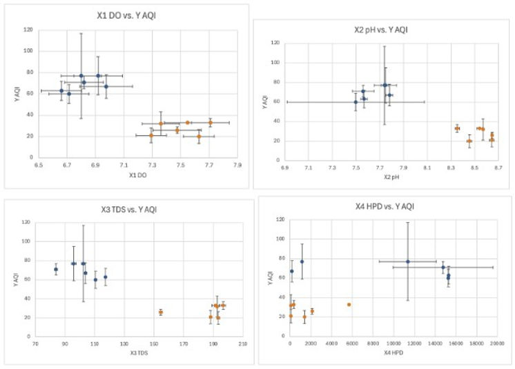 Figures 4-7. Scatter plots of each parameter against AQI demonstrating clustering of data (Han river dataset in blue, Donau river dataset in orange)